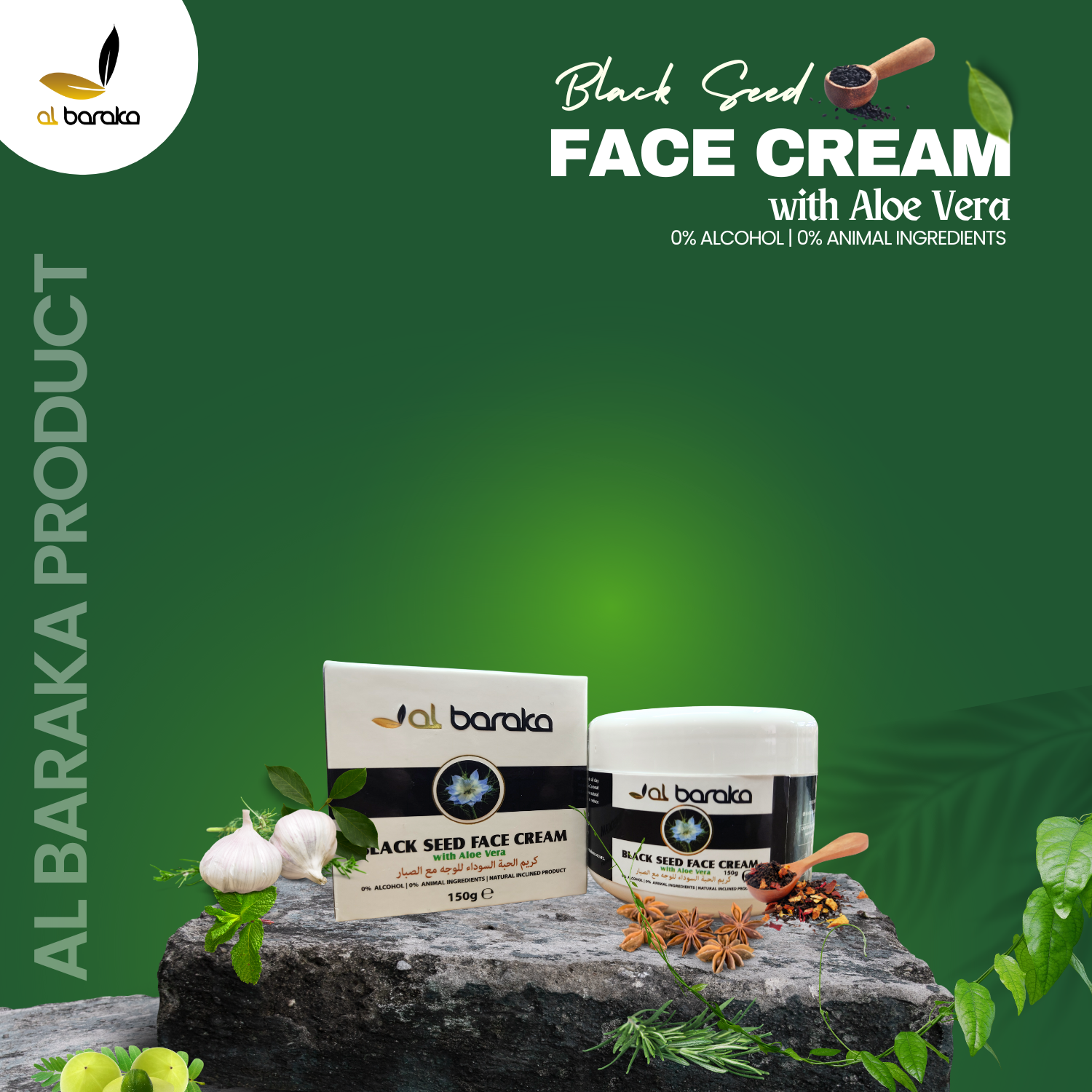 - Al Baraka Black Seed Cream is a combination of natural ingredients to provide all day moisturisation & nourishment for your skin. it is enriched with Black Seed Oil,Virgin Coconut Oil, Jojoba Oil, Turmeric Oil & Aloe Vera extract. the perfect combination of these natural extracts provides a natural glow by enhancing the complexion smoothening wrinkles, reducing the appearance of blemishes while providing all day moisturisation to your skin.